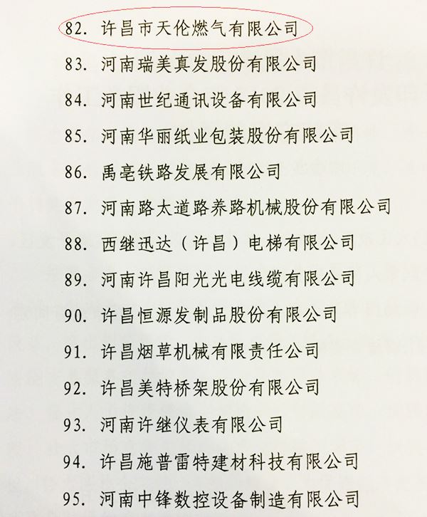 2015年2月28日,許昌市政府召開全市工業(yè)大會,市長張國暉主持會議。會議總結了2014年全市工業(yè)發(fā)展情況、部署了2015年工業(yè)和信息化發(fā)展工作,公布了許昌市100戶重點企業(yè)名單,許昌市天倫燃氣有限公司位列其中。