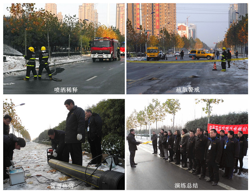 15時(shí)10分,消防隊(duì)到達(dá)現(xiàn)場(chǎng),開展噴灑作業(yè)稀釋燃?xì)鉂舛?、疏散人群封鎖道路;15時(shí)15分,公司搶險(xiǎn)隊(duì)到達(dá)現(xiàn)場(chǎng),與消防隊(duì)配合關(guān)閉上下游控制閥門、滅火、檢測(cè)現(xiàn)場(chǎng)燃?xì)鉂舛炔⑾蚋浇^(qū)張貼停氣通知;15時(shí)30分,搶修隊(duì)開始對(duì)DE250中壓管道搶修,刮口、固定、焊接;15時(shí)45分,搶修完畢;開啟控制閥門、查漏、置換、恢復(fù)供氣、打掃現(xiàn)場(chǎng);16時(shí),演練圓滿完成。