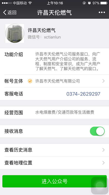 在微信公眾號中,選擇“許昌天倫”公眾號,點擊下方“進(jìn)入公眾號”