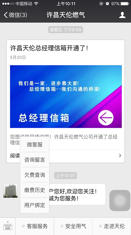 許昌天倫公司為了更好的服務(wù)廣大天然氣用戶,于2016年5月25日,“許昌天倫燃?xì)狻蔽⑿殴娞栃麻_通了“微客服”業(yè)務(wù),通過微信公眾號,天然氣用戶可以在微客服中進(jìn)行欠費查詢、繳費歷史查詢、以及在線了解天然氣等服務(wù)。