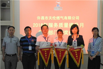 2016年5月31日上午8時30分,許昌天倫在九樓會議室舉行了“‘2016年服務(wù)質(zhì)量提升月’先進(jìn)部門頒獎儀式”,對表現(xiàn)突出的內(nèi)部服務(wù)部門財務(wù)部、外部服務(wù)部門客服部及車用氣公司進(jìn)行了表彰,總經(jīng)辦成員及各部門相關(guān)負(fù)責(zé)人參加了頒獎儀式。