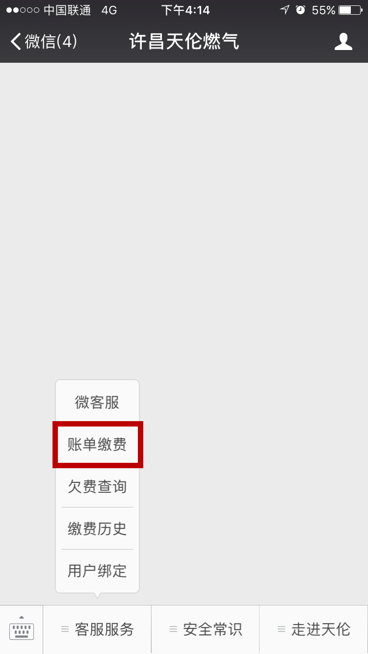 第四步進入微信公眾號點擊客服服務(wù)→點擊賬單繳費