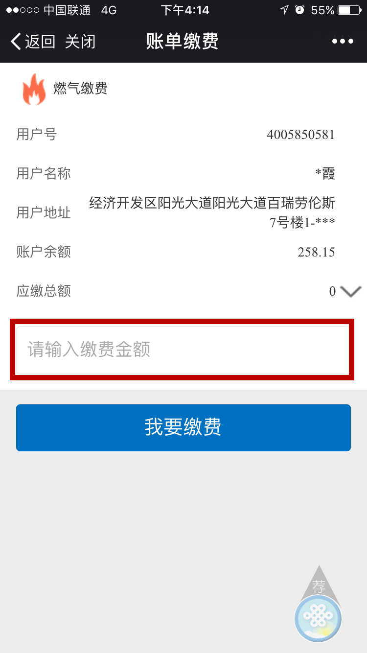 第六步根據(jù)賬單輸入繳費金額→點擊我要繳費→繳費成功